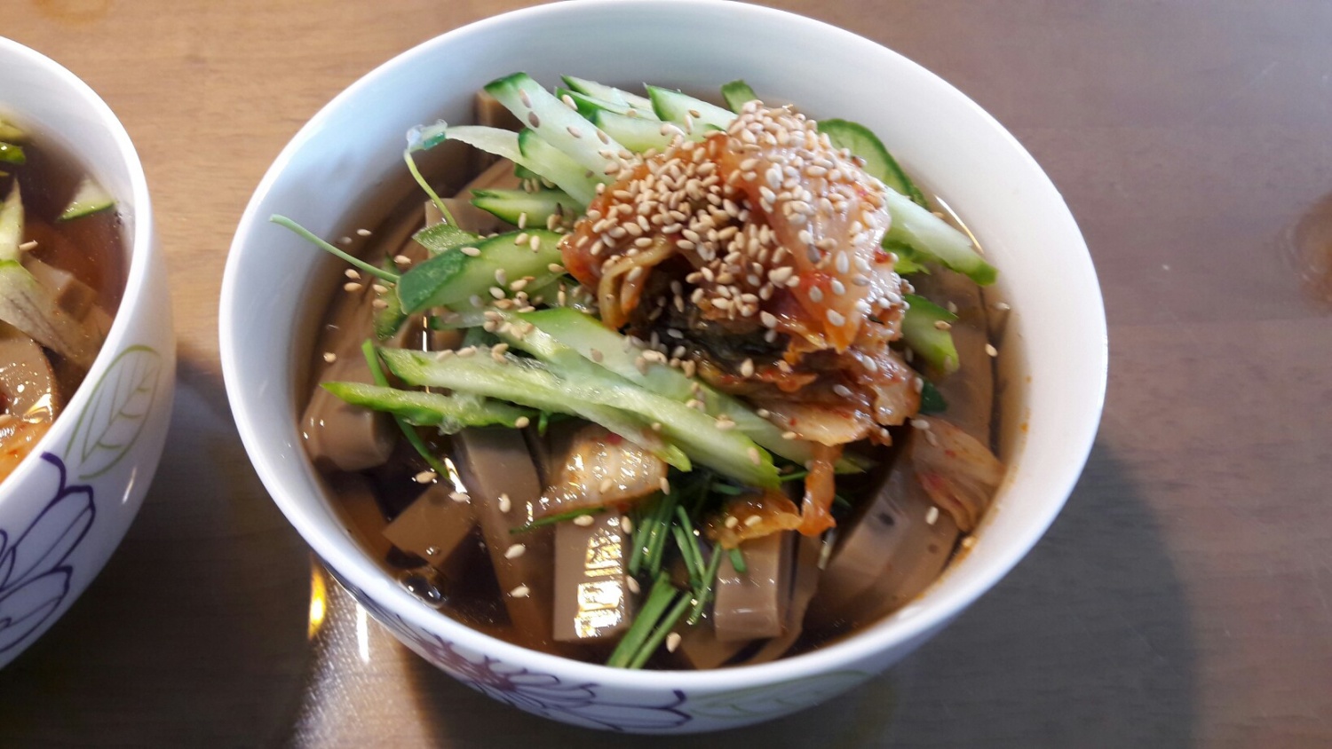 그릇에 묵을 가지런히 담고 멸치육수를 담아줍니다