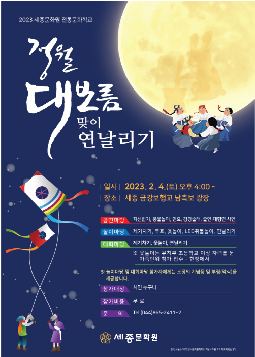 세종문화원의 주최로 시민들이 정월대보름의 의미를 떠올리며 즐길 수 있도록 온 가족이 다 함께 체험할 수 있는 다양한 프로그램들이 구성이 되어 소개되었습니다. 가정의 복을 기원하며 연날리기, 지신밟기, 윷놀이, 투호놀이, 제기차기, 쥐불놀이 등 각종 민속놀이들이 준비가 되어있으며 특히 정월대보름 맞이 연날리기 행사에서는 250개의 연이 미리 준비가 되어있으며 저녁에는 LED로 위험하지 않도록 쥐불놀이 체험 행사가 준비되어 있습니다.