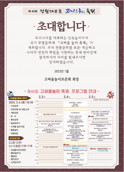 광주에서는 2월 3일(금)부터 2월 5일(일)까지 고싸움놀이 축제가 열립니다. 올해 40회를 맞이하는 이 축제는 광주 고싸움놀이 테마파크에서 고싸움놀이 시연과 달집 태우기 이외에도 다양한 체험 행사가 준비되어 있다고 합니다.