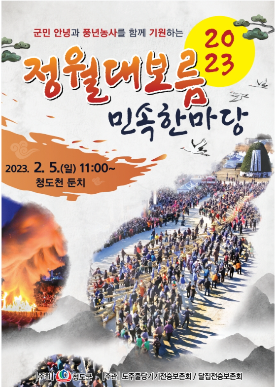 경북 청도군에서는 정월대보름을 맞이하여 청도천 둔치에서 2월 5일 오전 11시부터 정월대보름 민속 한마당을 개최합니다!