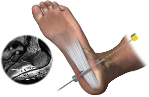 스테로이드 주사 요법은 치료를 충분히 한 후에도 증상의 호전이 없을때 사용하게 됩니다. 발뒤꿈치의 지방층이 위축되지 않도록 주사할 때 주의를 요합니다. 반복적인 주사는 근막을 손상시킬 수 있습니다.