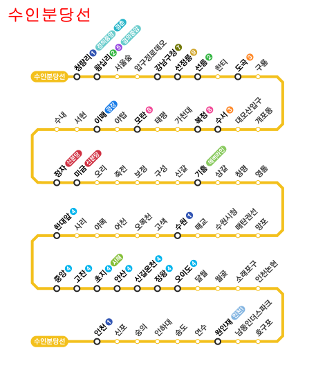 수인분당선의 노선도는 청량리와 왕십리의 서울에서 부터 압구정, 강남구청을 지나고 수서, 복정, 모란, 야탑, 이매, 서현 등 분당을 지나 신갈, 기흥, 수원시청, 수원역을 거치기도 합니다. 또한 수원에서 중앙, 고잔, 안산을 거쳐 월곶, 인천논현, 남동인더스파크, 연수, 인하대 , 숭의, 인천역까지 이어지는 긴 노선입니다.