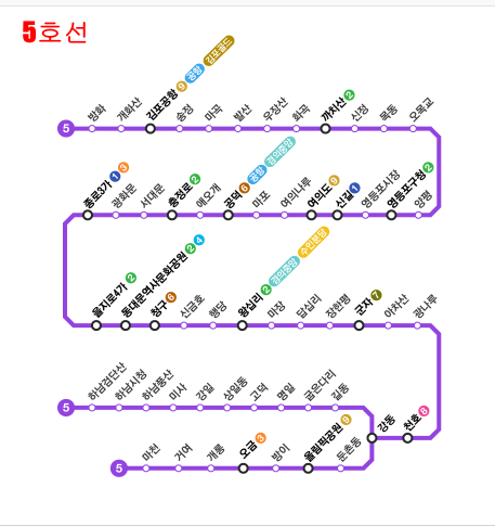 서울 지하철 노선도 5호선 입니다. 방화역에서 출발하여 강동역에서 노선이 나누어집니다. 하남검단산역과 마천역으로 나뉘니 강동역에서 노선도를 잘 확인하고 타셔야 합니다.