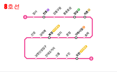 수도권 지하철 노선도 8호선은 암사역과 모란역이 종점입니다. 강동구청역과 잠실역, 석촌역 등이 있습니다.