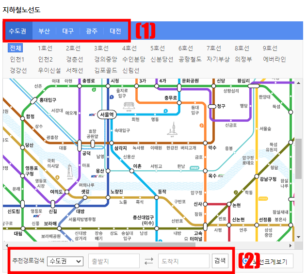 (1)에서 노선 선택이 가능하며 (2)에서 출발역과 도착역을 임력하고 경로탐색을 하면 최소시간, 최소거리 등을 편하게 검색할 수 있습니다.