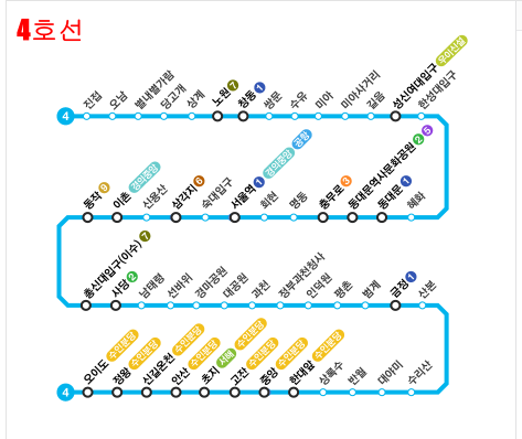 서울 지하철 노선도 4호선은 오이도역에서 당고개역까지 운행하고 있으며, 수인분당선과 연결됩니다.