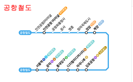 서울역을 출발하여 김포공항, 인천공항 1터미널, 인천공항 2 터미널까지 운행되는 노선입니다.