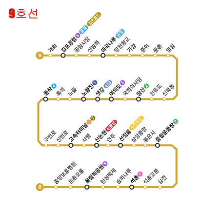 수도권 지하철 9호선은 개화역과 중앙보훈병원역이 종접이며 노량진역, 국회의사당역, 올림픽공원역 등을 지나가고 있습니다.