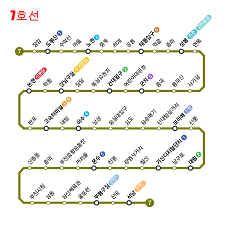 서울 지하철 노선도 7호선은 장암역과 석남역이 종점입니다. 도봉산역 및 어린이대공원역, 청담역과 강남구청역 등이 있습니다.