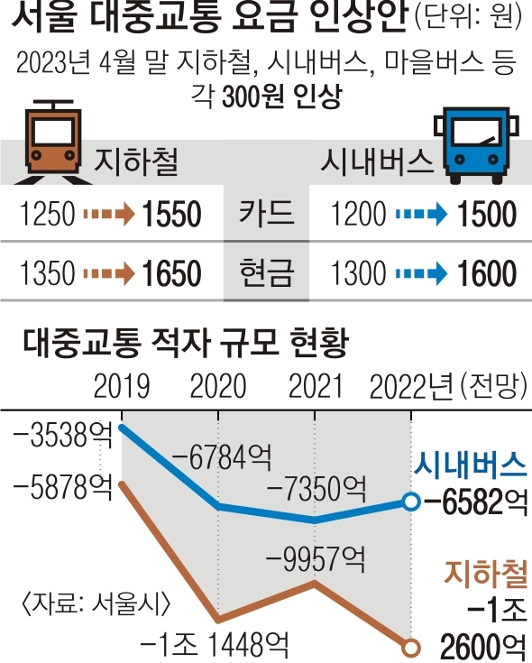 서울 지하철과 버스 요금이 이르면 2023년부터 오른다고 합니다. 인상 폭은 지하철과 버스 모두 300원이 유력하다고 하는데요. 서울시의 대중교통 요금은 2015년 6월 마지막으로 인상된 이후 8년 만인 2023년에 요금이 인상되는 셈입니다. 현재 서울 대중교통 일반요금은 카드 기준으로 지하철이 1천250원, 시내버스는 1천200원입니다. 300원씩 인상된다면 지하철은 1천550원, 시내버스는 1천500원이 될 가능성이 큽니다.