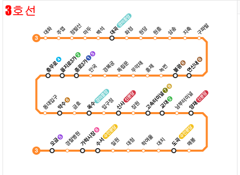 수도권 지하철 노선도 3호선은 대화역과 오금역이 종점입니다.