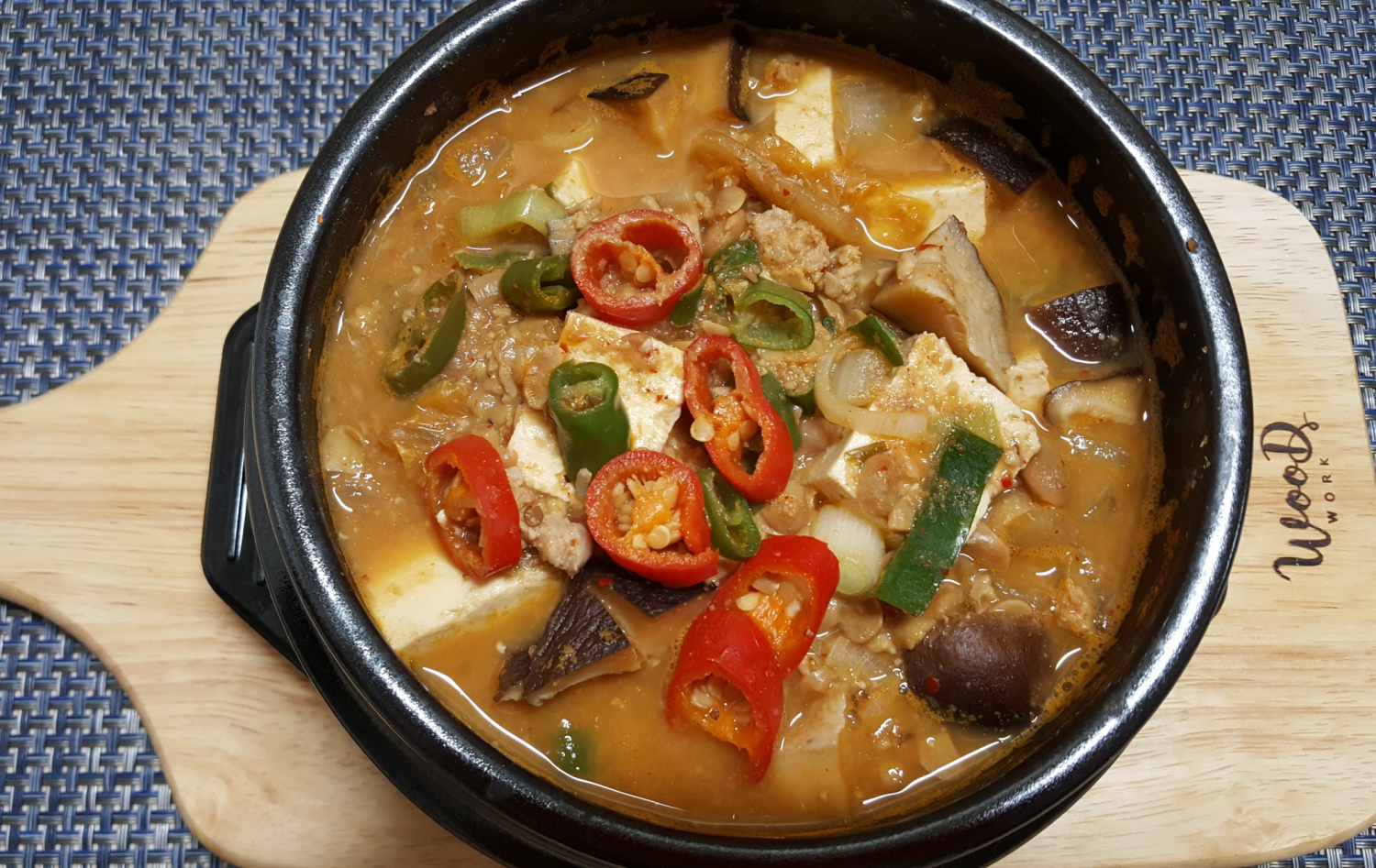 두부에 어느 정도 간이 살짝 베어들어가면 불을 끄고 보글보글한 청국장을 뚝배기 채로 상에 올려냅니다.