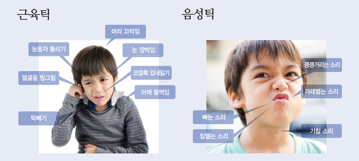 틱장애 증상으로 운동 틱과 음성 틱으로 구별할 수 있습니다.