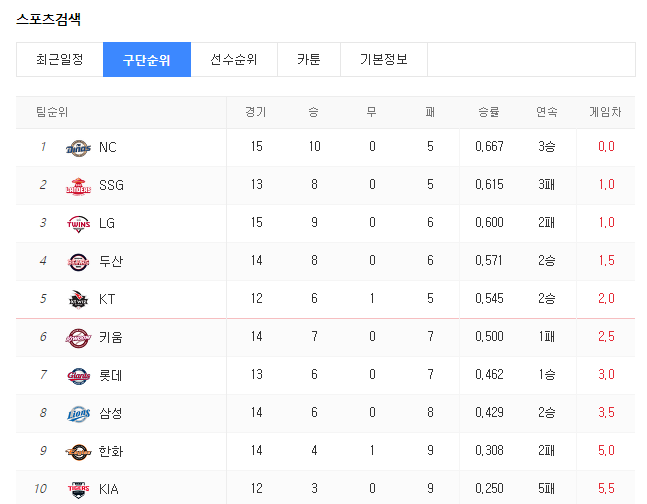 NC다이노스가 3연승을 기록하며 좋은 출발을 보이고 있습니다. SSG랜더스는 3 연패하며 2위로 추락합니다.