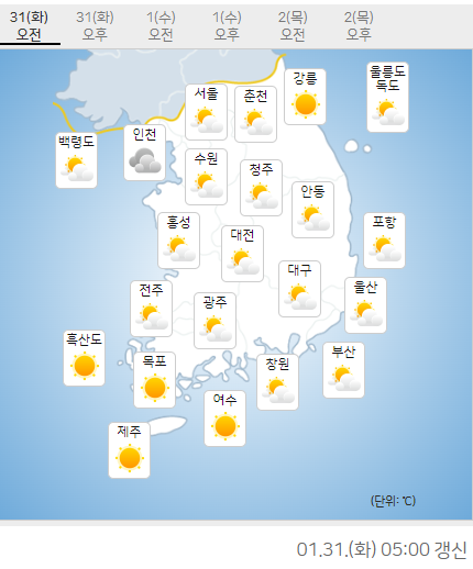 1월 31일 오늘부터 2월 2일 목요일까지 날씨 전망입니다.