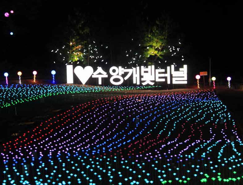 단양 수양개터널이 새로운 테마파크인 수양개빛터널로 새단장되었습니다. 터널 내부는 빛이 차단되는 장점을 최대한 활용해 고품격 음향과 시뮬레이션 영상, 조명, 4D 어트랙션 등이 합쳐진 새로운 개념의 멀티미디어 쇼가 펼쳐지며 터널 외부 공간에는 5만 송이 LED꽃 등의 일루미네이션으로 꾸며져 있습니다.