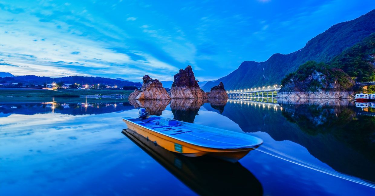 단양팔경 여행코스 중에서도 도담삼봉은 단양8경 중 으뜸으로 손꼽힐 정도로 경치가 뛰어나고 정선, 김홍도 등 조선 유명 화가들의 작품에서도 흔하게 찾아볼 수 있을 정도입니다. 조선 개국공신인 정도전의 호인 ‘삼봉’과 이름이 같아서 정도전 관련 얘기가 전해 오는 곳이기도 합니다. 제트보트도 탈 수 있습니다.