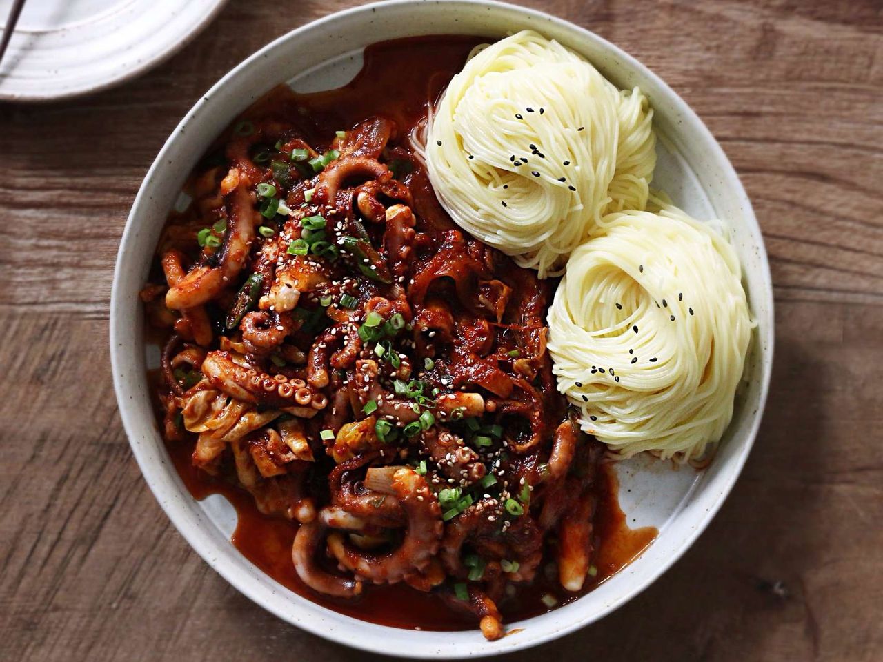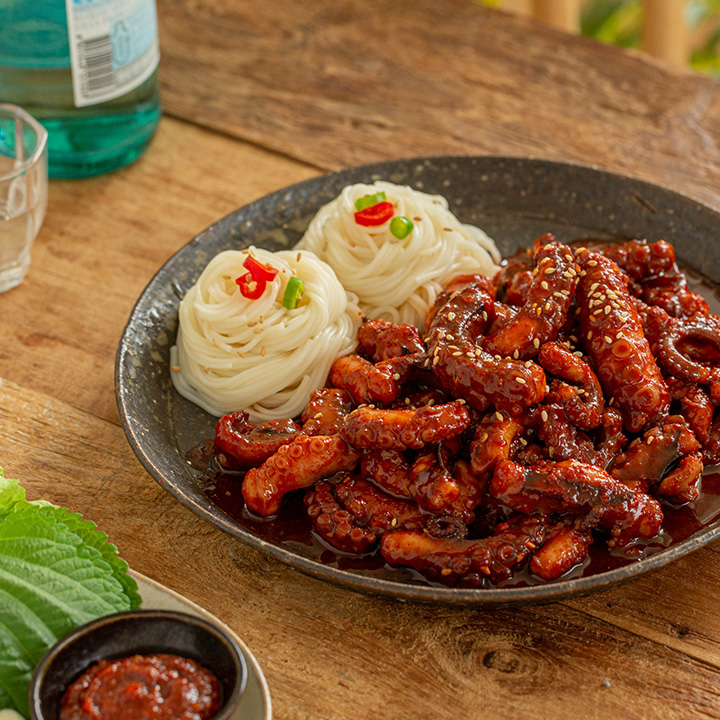 소면을 한줌 삶아 낙지볶음 옆에 함께 놓으면 아주 잘 어울리는 조합이 됩니다.