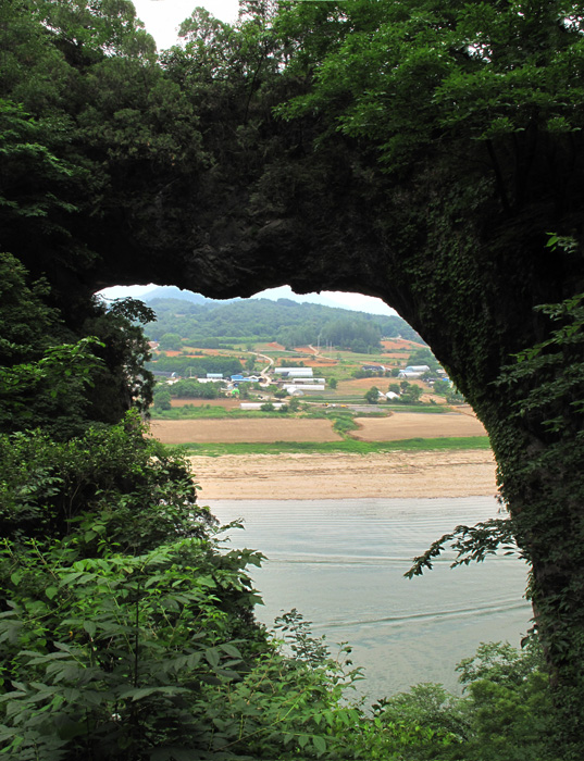 도담삼봉을 보았다면 같이 보아야할 곳은 석문입니다. 뻥 뚫린 동굴 사이로 남한강변 마을이 보이는 석문은 국가명승 제45호로 지정되어 있는데 도담삼봉이 국가명승 제 44호이니 바로 근처라는 것을 알 수 있을 겁니다.