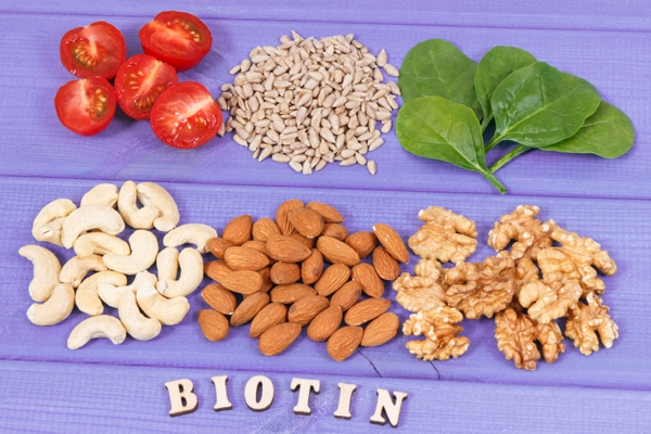 비오틴이 많이 들어있는 음식에는 돼지고기, 육류 내장(간), 우유, 달걀노른자 (익히지 않은 달걀흰자는 비오틴 흡수를 방해합니다), 연어, 통곡물, 맥아, 견과류, 라즈베리, 호두, 컬리플라워, 양송이, 효모, 감자, 바나나, 브로콜리, 시금치 등이 있습니다. 다양하게 많은 식품들이니 식사할 때 참고를 하면 좋겠습니다.