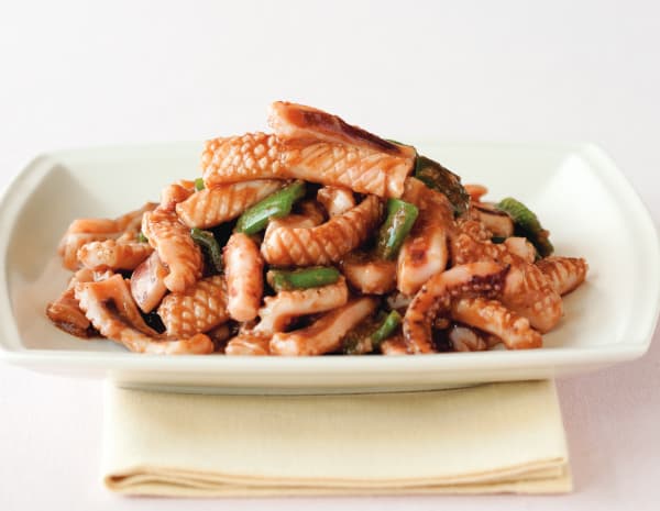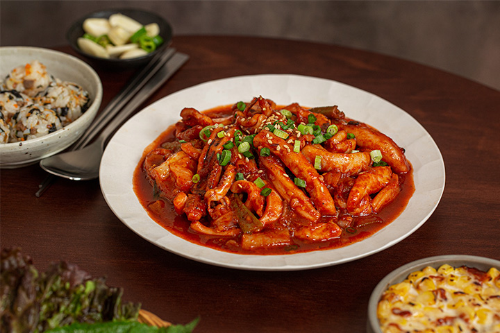 센 불에 재빨리 볶아야 오징어 겉면이 빨리 익으면서 수분이 빠지지 않습니다.