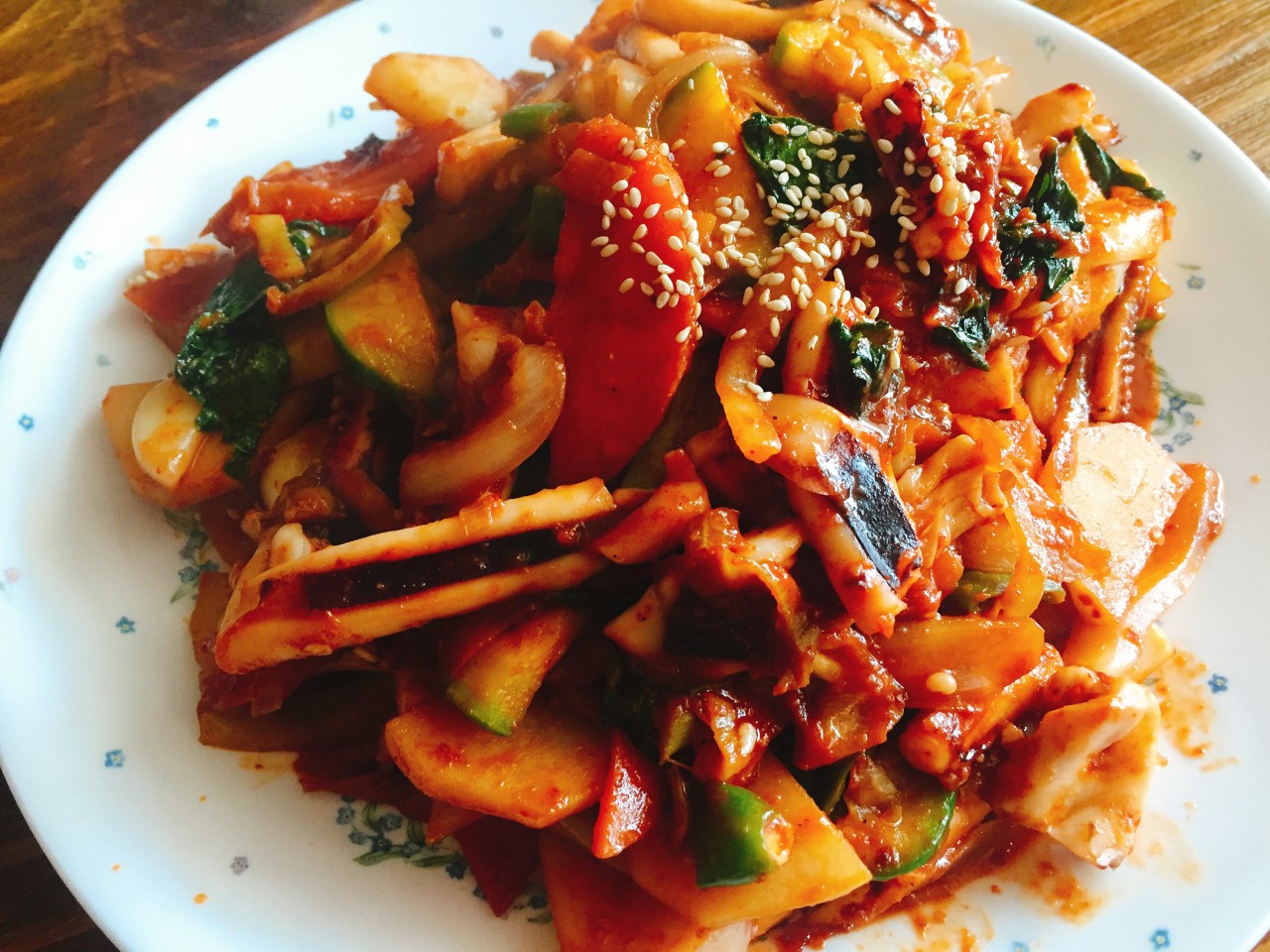 파도 찹찹하게 잘 볶아지면 불을 끄고 참기름과 통깨를 넣고 잘 섞어주면 오징어볶음 완성입니다.