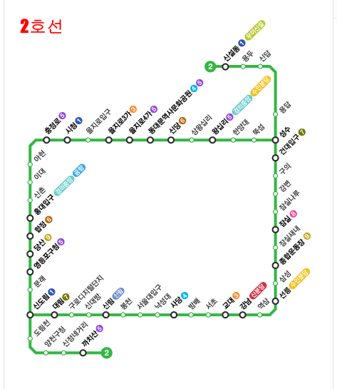 수도권 지하철 노선도 2호선은 신설동에서 탑승하고 성수역에서 나뉘는 노선입니다. 성수역에서 어느 방향으로 타던 신도림역에서 만나게 되는 순환형 노선입니다. 종점은 신설동역과 까치산역입니다.