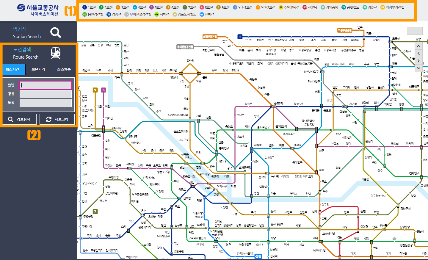 (1)에서 노선 선택이 가능하며 (2)에서 출발역과 도착역을 임력하고 경로탐색을 하면 최소시간, 최소거리 등을 편하게 검색할 수 있습니다.