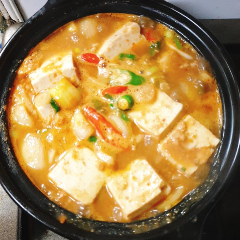 두부에 어느 정도 간이 살짝 베어들어가면 불을 끄고 보글보글한 청국장을 뚝배기 채로 상에 올려냅니다.